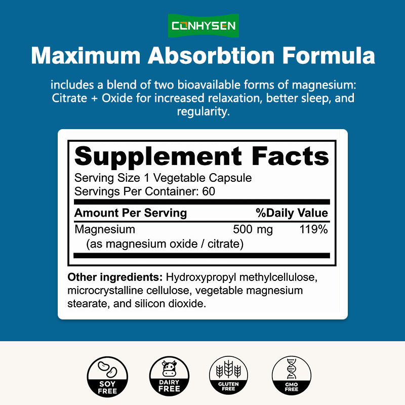 Las cápsulas de magnesio son suplementos dietéticos compuestos principalmente de elementos de magnesio o compuestos de magnesio, con el objetivo de proporcionar al cuerpo el magnesio mineral necesario.Como el cuarto cation principal en el cuerpo humanoEl magnesio desempeña un papel crucial en más de 300 reacciones bioquímicas, participando en importantes procesos fisiológicos como el metabolismo energético, la síntesis de proteínas y la transmisión de señales nerviosas.Las cápsulas de magnesio contienen diferentes formas de sales de magnesio, como el óxido de magnesio, el citrato de magnesio y la glicina de magnesio, dentro de las cápsulas,proporcionar una forma conveniente y eficiente de suplementar magnesio para las personas que tienen una ingesta insuficiente de magnesio debido a una dieta monótona o necesidades fisiológicas especiales.