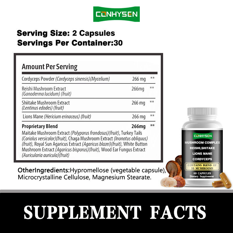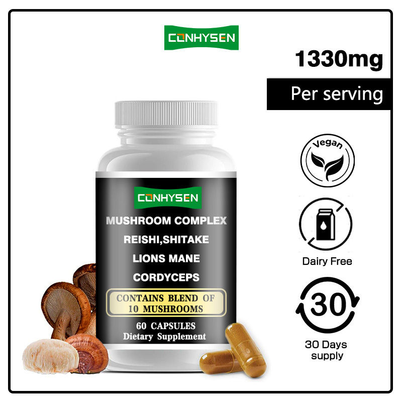 Etiquetas privadas Cápsulas complejas de hongos Aumenta la salud inmunológica del intestino Energía 10 hongos