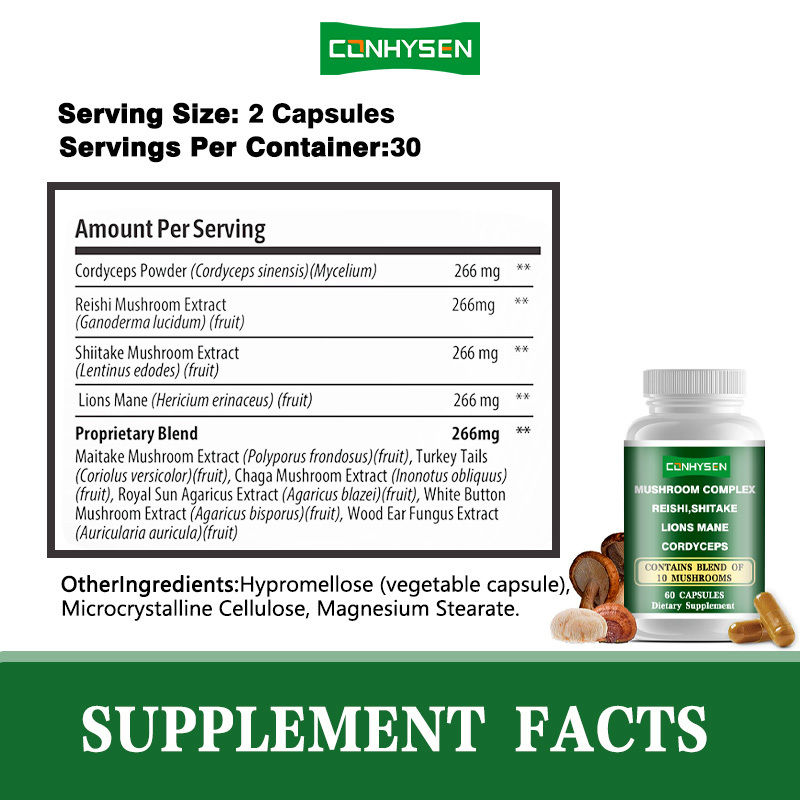 Las Cápsulas de Complejo de Hongos son un suplemento dietético que está científicamente formulado y refinado a partir de varios hongos funcionales como Reishi, Shiitake, micelio de Lingzhi y Tremella. Incorpora los valiosos ingredientes activos como polisacáridos, terpenoides, ergotioneína y minerales de estos hongos, actuando como un depósito de salud natural que proporciona protección multidimensional para la salud del cuerpo humano.