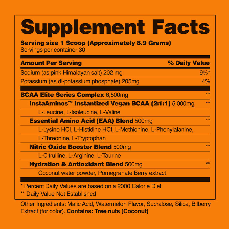 Ingredientes:Sodio, potasio, complejo de la serie BCAA Elite, BCAA vegano instanciado, mezcla de aminoácidos esenciales, mezcla de refuerzo de óxido nítrico, mezcla de hidratación y antioxidantes