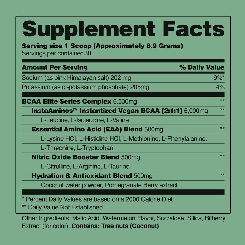 Ingredientes: Sodio, Potasio, Complejo BCAA Elite Series, BCAA vegano instantáneo, Mezcla de aminoácidos esenciales, Mezcla potenciadora de óxido nítrico, Mezcla de hidratación y antioxidantes