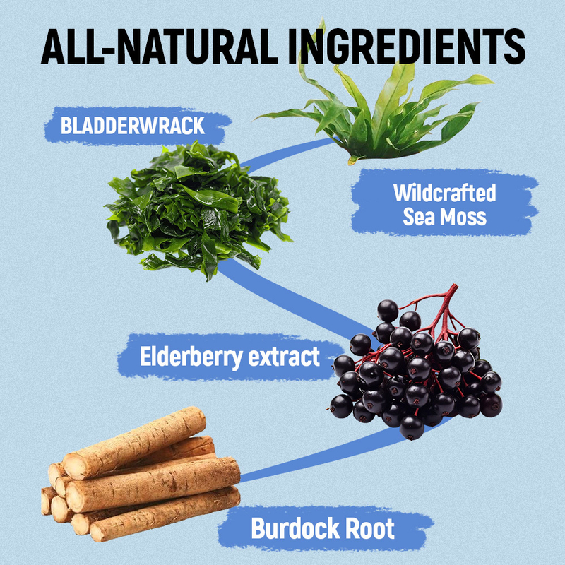 Musgo marino, fucus, raíz de bardana, extracto de saúco, zinc, vitamina C