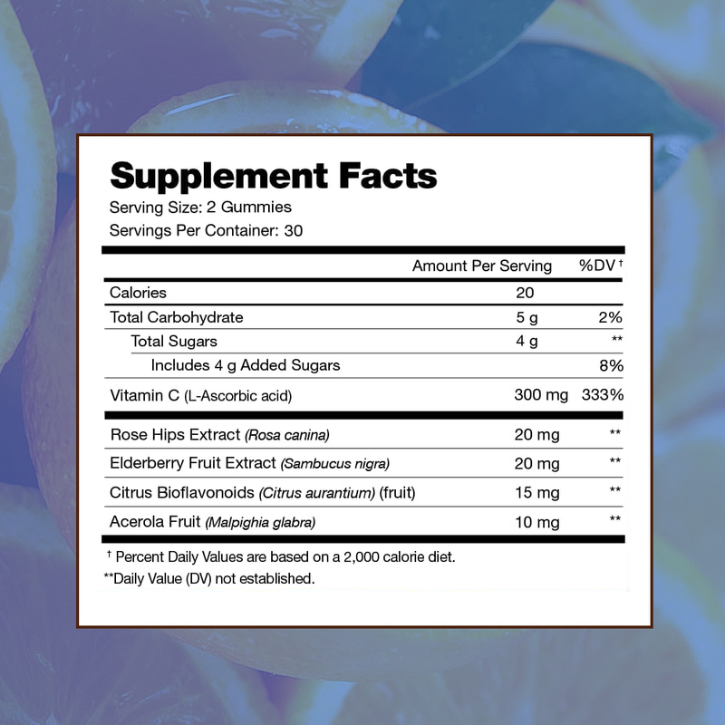 Vitamina C, extracto de rosa, extracto de fruto de morera, bioflavonoides cítricos, fruto de acerola
