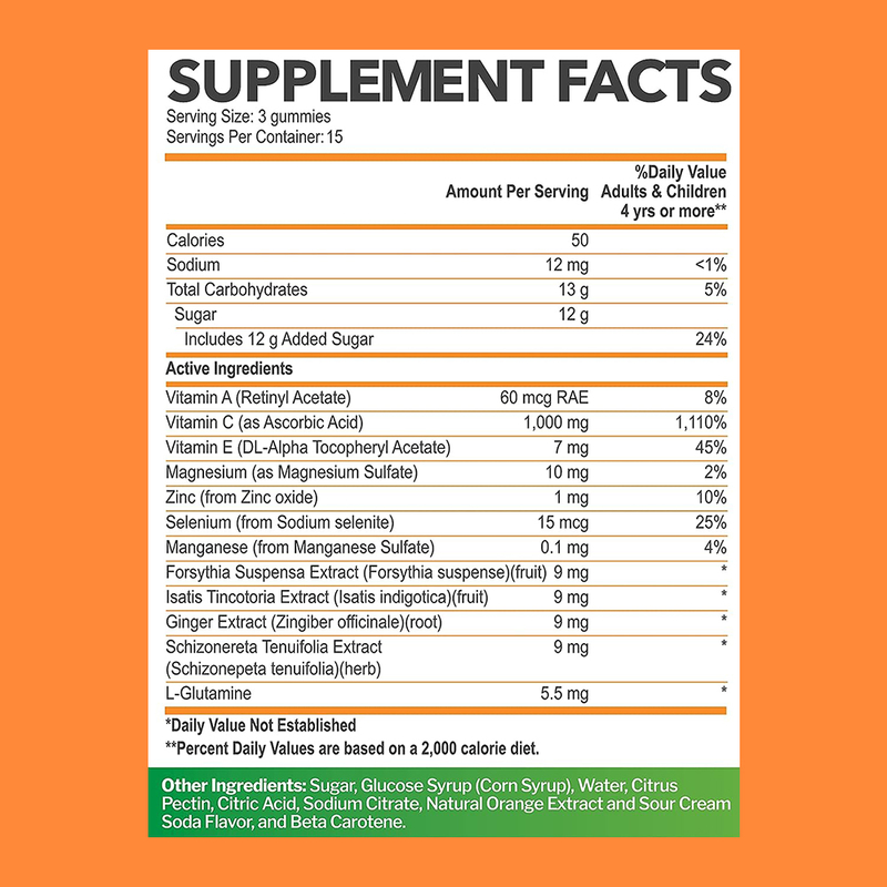 Vitamina C, Vitamina A, Vitamina E, Zinc, Magnesio, Selenio, Manganeso, Extracto de Jengibre, Extracto de Forsythia Suspensa, Extracto de Isatis Tincotoria, Extracto de Schizonereta Tenuifolia, L-Glutamina