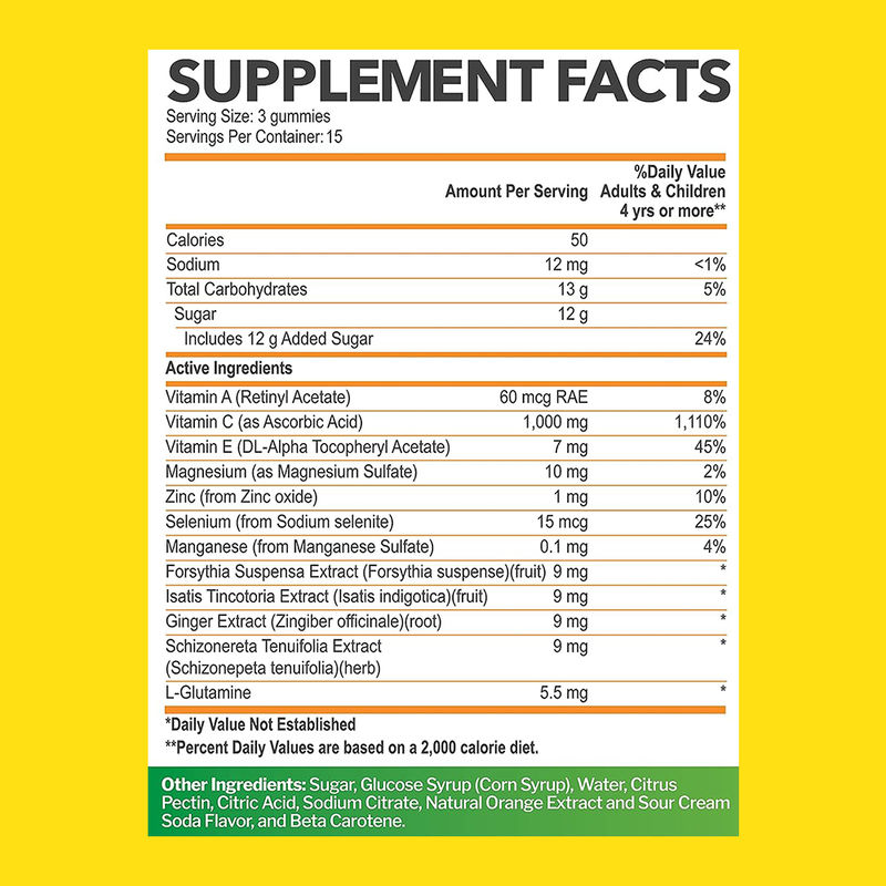 Vitamina C, Vitamina A, Vitamina E, Zinc, Magnesio, Selenio, Manganeso, Extracto de Jengibre, Extracto de Forsythia Suspensa, Extracto de Isatis Tincotoria, Extracto de Schizonereta Tenuifolia, L-Glutamina
