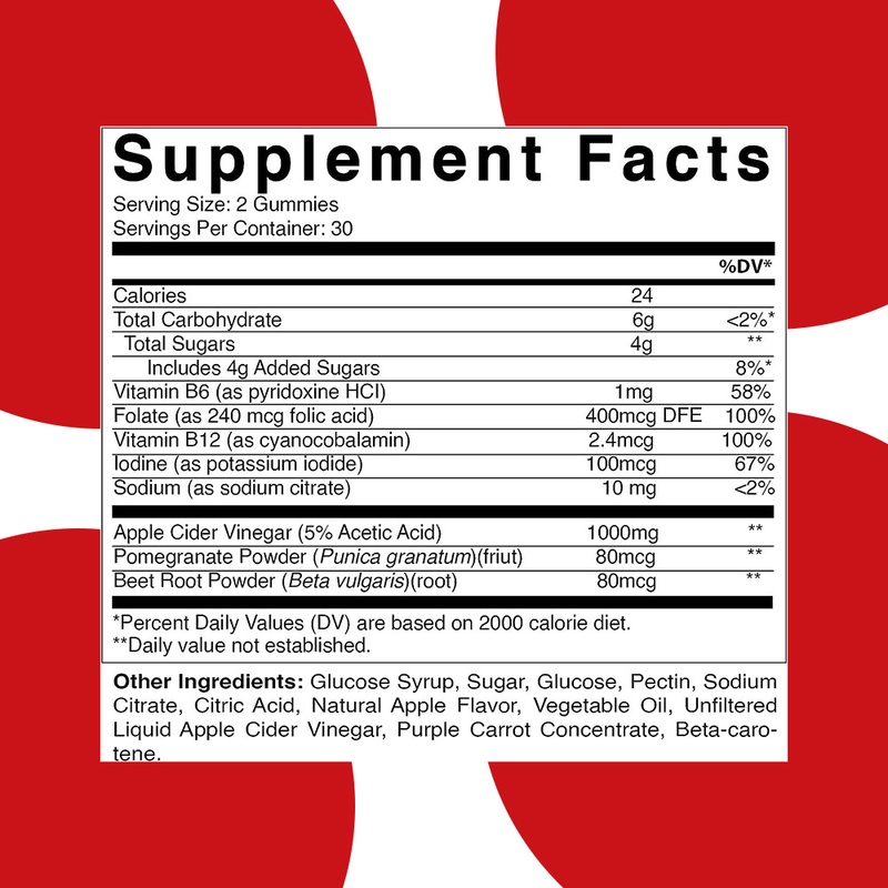 Vinagre de Sidra de Manzana, Vitamina B6, Folato, Vitamina B12, Yodo, Sodio, Polvo de Granada, Polvo de Remolacha
