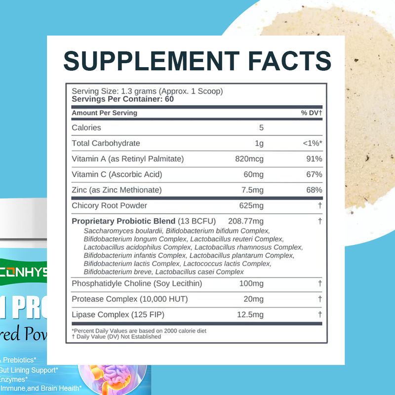 Vitamina A, Vitamina C, Zinc, Polvo de raíz de achicoria, Mezcla probiótica exclusiva, Fosfatidilcolina, Complejo de proteasas, Complejo de lipasas