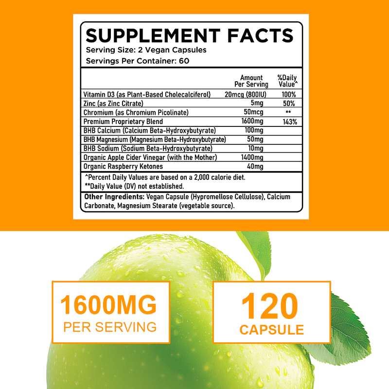 Vinagre de Sidra de Manzana Orgánico, Vitamina D3, Zinc, Cromo, Mezcla Patentada Premium, BHB Calcio, BHB Magnesio, BHB Sodio, Cetonas de Frambuesa Orgánicas