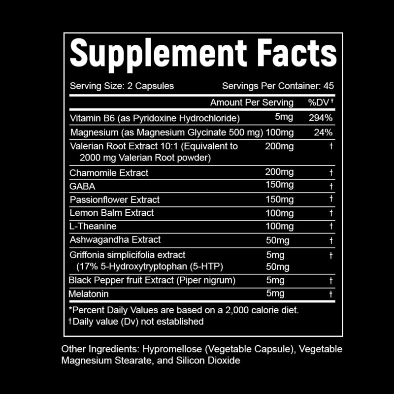 Vitamina B6, Magnesio, Extracto de raíz de valeriana, Extracto de manzanilla, GABA, Extracto de pasiflora, Extracto de bálsamo de limón, L-teanina, Extracto de ashwagandha, Extracto de Griffonia Simplicifolia, Extracto de fruto de pimienta negra, Melatonina