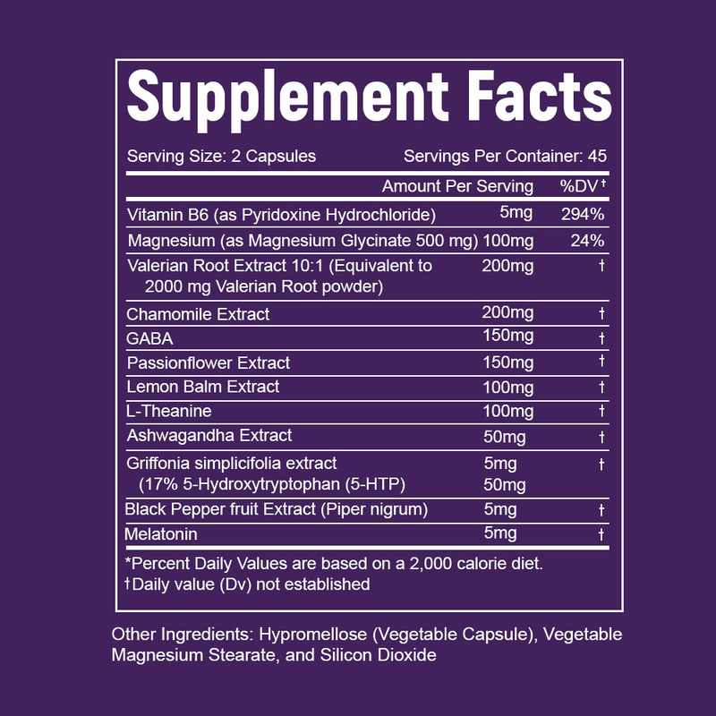 Vitamina B6, Magnesio, Extracto de raíz de valeriana, Extracto de manzanilla, GABA, Extracto de pasiflora, Extracto de bálsamo de limón, L-teanina, Extracto de ashwagandha, Extracto de Griffonia Simplicifolia, Extracto de fruto de pimienta negra, Melatonina