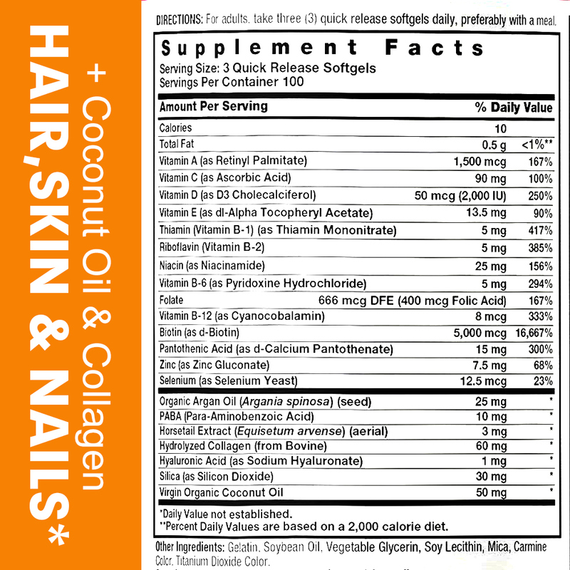 Multivitamins, Organic Argan Oil, PABA, Hydrolyzed Collagen, Virgin Organic Coconut Oil, Silica, Zinc, Biotin